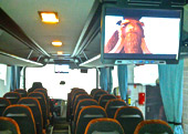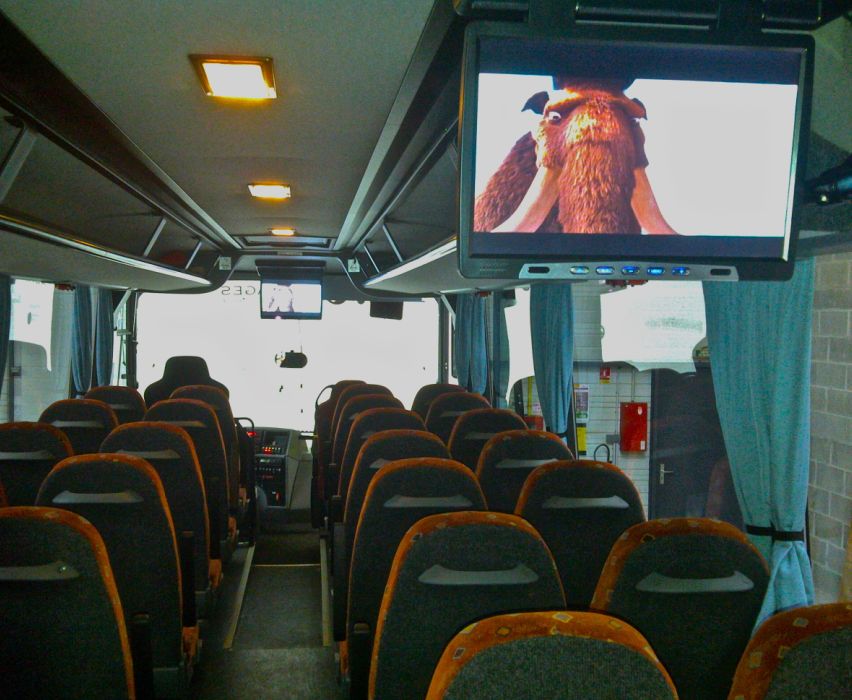 Éléments de confort: Sièges inclinables, reposes pieds, radio/CD, Micro, DVD Vidéo, double écran plat.